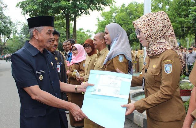 Martapura, InfoPublik – Pemerintah Kabupaten Banjar Provinsi Kalimantan Selatan, menyerahkan 189 sertifikat Program Pengembangan Keprofesian Berkelanjutan Jenjang Sekolah dasar, kepada para guru di daerah setempat. Sertifikat diserahkan oleh Bupati H Khalilurrahman secara simbolis kepada tiga perwakilan guru usai apel di halaman kantor Pemerintah Kabupaten Banjar, Senin (2/7). Bupati yang didampingi oleh Sekretaris Daerah Banjar H Nasrunsyah dan Kepala Dinas Pendidikan H. Gusti Ruspan Noor, mengucapkan selamat kepada para guru yang menerima sertifikat pengembangan profesi tersebut. Dia berharap ke depan kualitas para pendidik di Kabupaten banjar akan terus meningkat.