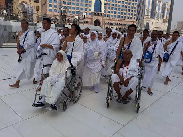 Di rombongan 6 kelompok terbang (keloter) 9 misalnya, para jamaah bergantian membantu mendorong kursi roda, tiga anggota rombongannya yang berusia lanjut. Ketiga jamaah berusia lanjut tersebut dua wanita dan seorang laki-laki, harus menggunakan kursi roda karena kondisinya tak memungkinkan untuk berjalan.