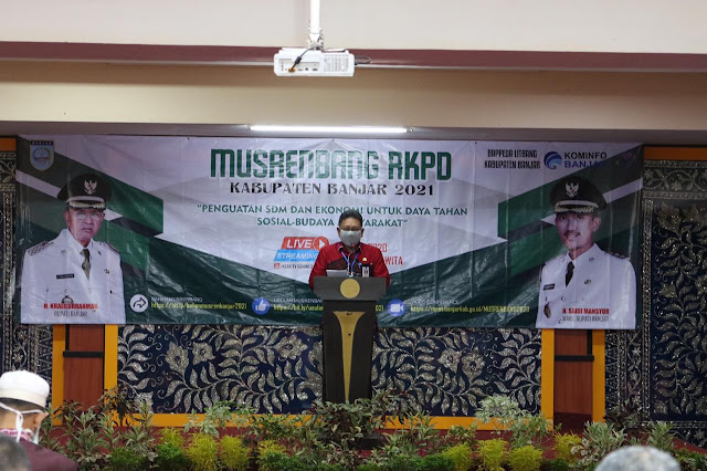 Bupati Banjar H Khalilurrahman dalam hal ini diwakili Sekda Banjar HM Hilman membuka secara resmi Musrenbang tersebut dengan tema “Penguatan SDM dan Ekonomi Untuk Daya Tahan Sosial Budaya Masyarakatâ€.
