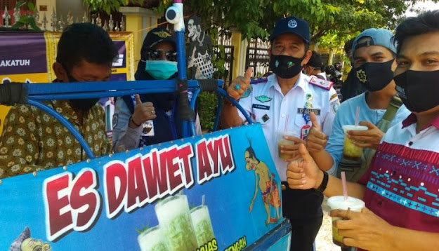 “yang jualan mantap pakai masker, pantas cepat habis” ujar salah satu petugas yang berada disekitar rombong es dawet Nasiruddin. (MC Kab. Banjar/Ronny/Mey)