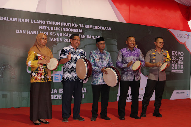 Bupati Banjar, H Khalilurrahman didampingi Ketua TP PKK Banjar, Hj Raudathul Wardiyah resmi membuka Banjar Expo 2019 dengan pemukulan rebana dan pemotongan untaian bunga melati, Jumat (23/8/2019) sore. Hadir Dandim 1006/Martapura, Letkol Arm Siswo Budiarto, Wakapolres Banjar, Joseph Edwar Purba, Sekda Banjar, HM Hilman serta para kepala Organisasi Perangkat Daerah (OPD) dilingkungan Pemkab Banjar.