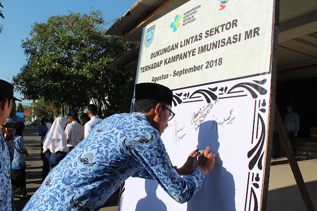Penandatanganan pernyataan mendukung kampanye imunisasi MR lintas sektor, selanjutnya diikuti oleh Sekda Banjar H Nasrunsyah, Ketua Tim Penggerak PKK Kabupaten Banjar, Hj Raudathul Wardiyah, para pejabat forum komunikasi pimpinan daerah (Forkopimda) Banjar serta para kepala SKPD.