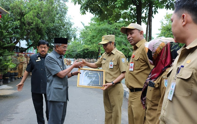 Penghargaan diserahkan oleh Bupati Banjat H Khalilurrahman kepada Kepala Dinas Tenaga Kerja dan Transmigrasi Banjar H Safrin Noor, usai apel kerja gabungan lingkup Pemerintah Kabupaten Banjar di halaman kantor Pemkab Banjar, Senin (26/11).