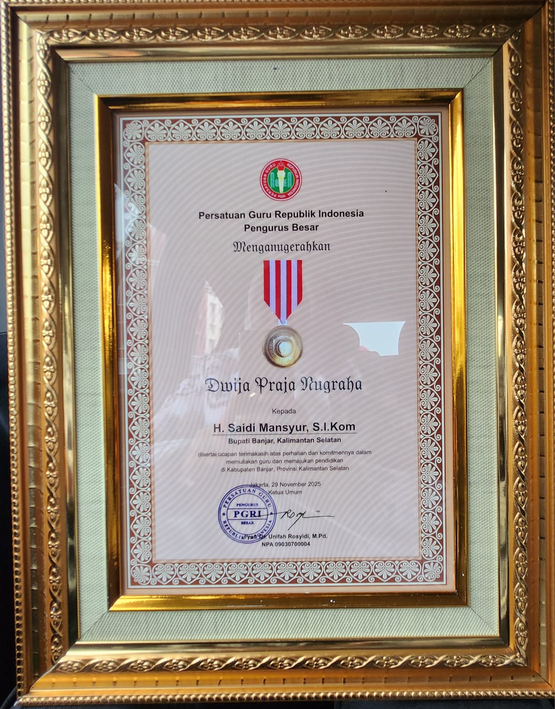 JAKARTA – Bupati Banjar H Saidi Mansyur menjadi salah satu kepala daerah meraih penghargaan Dwija Praja Nugraha, pada Puncak Peringatan HUT ke 80 Persatuan Guru Republik Indonesia (PGRI), yang berlangsung di Britama Arena Kelapa Gading, Jakarta, Sabtu (29/11/2025).