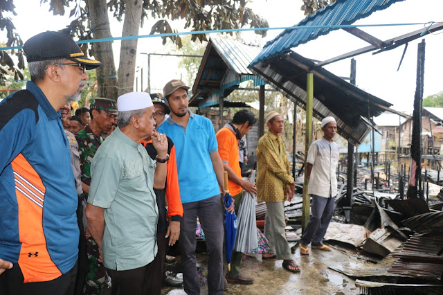 Bupati Banjar H Khalilurrahman, didampingi Kepala Badan Penanggulangan Bencana Daerah Kabupaten Banjar HM Irwan Kumar, Sekretaris Dinas Sosial Banjar Sirajudin, Camat Astambul, Jurzi Zaidan meninjau lokasi pascakebakaran dan memberikan bantuan ketanggap daruratan.