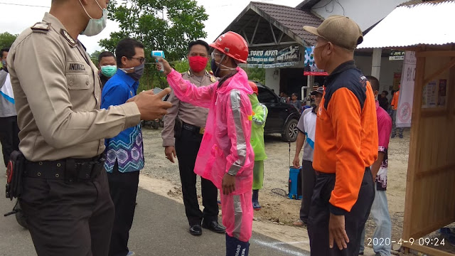 Aparatur desa beserta sejumlah relawam dan masyarakat Desa Abumbun Jaya melakukan berbagai upaya pencegahan covid-19 masuk ke desa mereka.