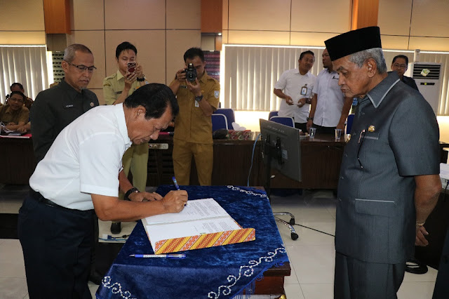 Disaksikan Bupati Banjar H Khalilurrahman didampingi Sekda Banjar H Mokhammad Hilman, Kepala Dinas Disdukcapil Banjar Azwar menandatangani Memorandum of Understanding (MoU) tentang pengajuan pelaporan kelahiran secara online dengan Rumah Sakit Umum (RSU) Danau Salak, pada saat Rakor Mingguan SKPD lingkup Kabupaten Banjar, di Aula Barakat, Martapura, Senin (5/8/2019).