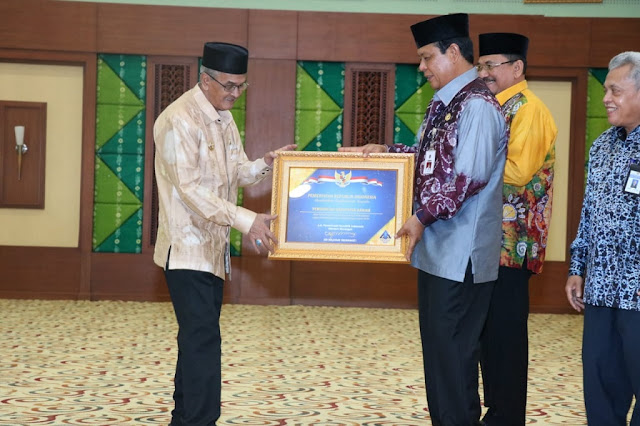 Martapura,InfoPublik – Kesuksesan Pemerintah Kabupaten Banjar yang telah mendapat predikat opini WTP Enam kali berturut-turut dari BPK, mendorong Gubernur Kalsel H.Sahbirin Noor memberikan plakat penghargaan kepada Bupati Banjar H. Khalilurrahman pada Rapat Koordinasi Kepala Daerah Tingkat Provinsi Kalimantan Selatan Tahun 2019 di Aula Gedung Ideham Chalid, Banjarbaru, Kamis (10/10/2019).