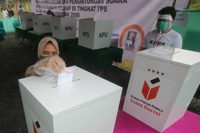 Ia juga menambahkan, pada simulasi ini TPS dilengkapi dengan dua kotak suara dan empat bilik pencoblosan serta Bilik Khusus bagi pemilih yang suhu tubuhnya diatas 37°C, dengan tujuan agar tidak berinteraksi pada saat pilkada berlangsung.