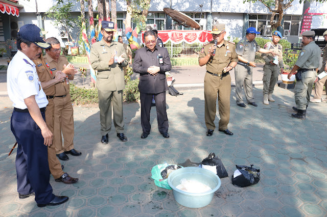 Martapura, InfoPublik – Sejumlah barang bukti hasil tangkapan Satpol PP Kabupaten Banjar dimusnahkan usai apel rutin gabungan di halaman Pemkab Banjar, Senin (26/8/2019). Barang bukti yang dimusnahkan adalah minuman beralkohol, merupakan hasil tangkapan pada 19 Agustus 2019 lalu.
