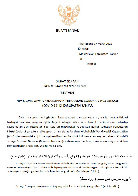 Dalam rangka meningkatkan kewaspadaan dan pencegahan serta sebagai salah satu bentuk perlindungan, keselamatan dan kesehatan seluruh masyarakat Kabupaten Banjar terhadap penyebaran infeksi Covid-19 dan menindaklanjuti pernyataan Presiden RI tentang penyebaran Covid-19 sebagai Bencana Nasional (Bencana Nonalam), dengan ini Bupati Banjar menghimbau kepada masyarakat Kabupaten Banjar untuk memperhatikan hal-hal (terlampir dalam surat edaran berikut).