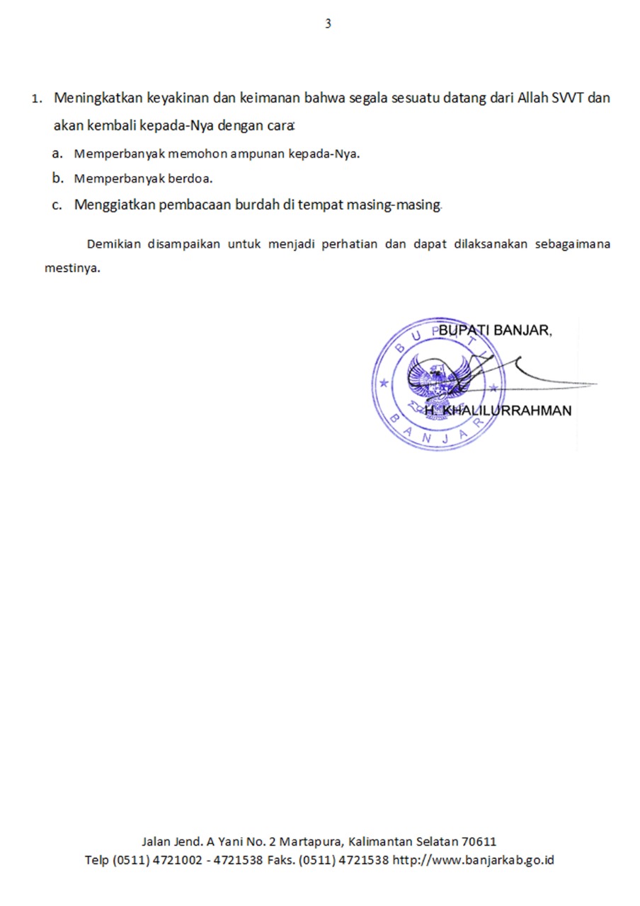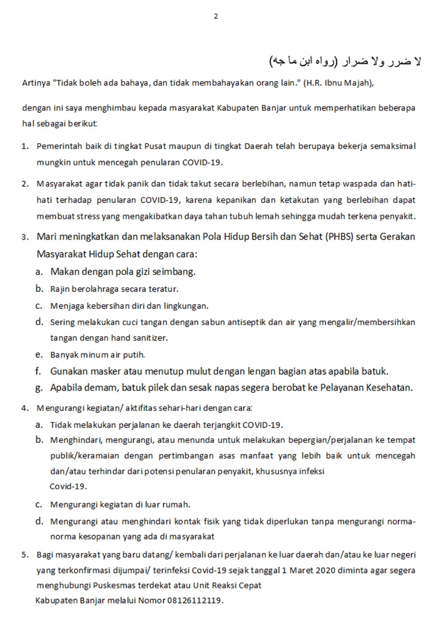 Dalam rangka meningkatkan kewaspadaan dan pencegahan serta sebagai salah satu bentuk perlindungan, keselamatan dan kesehatan seluruh masyarakat Kabupaten Banjar terhadap penyebaran infeksi Covid-19 dan menindaklanjuti pernyataan Presiden RI tentang penyebaran Covid-19 sebagai Bencana Nasional (Bencana Nonalam), dengan ini Bupati Banjar menghimbau kepada masyarakat Kabupaten Banjar untuk memperhatikan hal-hal (terlampir dalam surat edaran berikut).