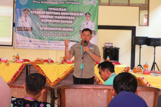 Martapura, InfoPublik – Dinas Kebudayaan dan Pariwisata Kabupaten Banjar melakukan berbagai upaya untuk mengenalkan daya tarik pariwisata, salah satunya dengan menyelenggarakan Sosialisasi Gebrak Parawisata, yang terdiri dari masyarakat yang peduli dengan peningkatan wisata, di Aula Kecamatan Aranio, Kabupaten Banjar, Selasa (16/4).